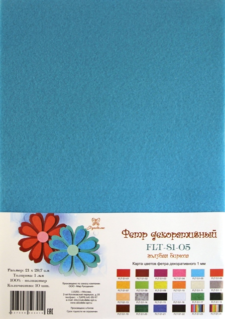 Фетр SOFT, ГОЛУБАЯ БИРЮЗА, 180г, толщина 1мм,в наборе 10 л., Рукоделие, FLT-S1-05