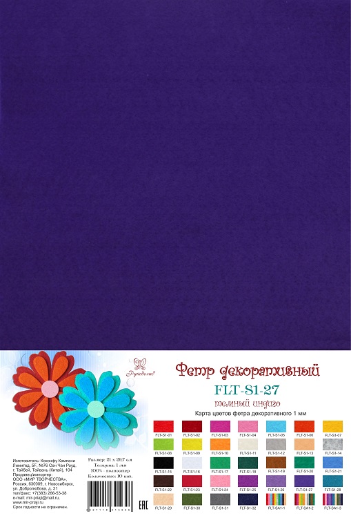 Фетр SOFT, Темный индиго, 180г, толщина 1 мм, в наборе 10 л.,Рукоделие, FLT-S1-27